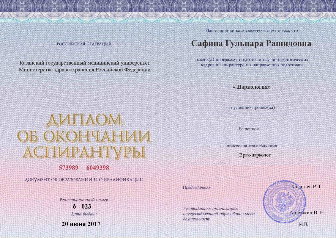 Диплом об окончании аспирантуры Сафиной Гульнары Рашидовны