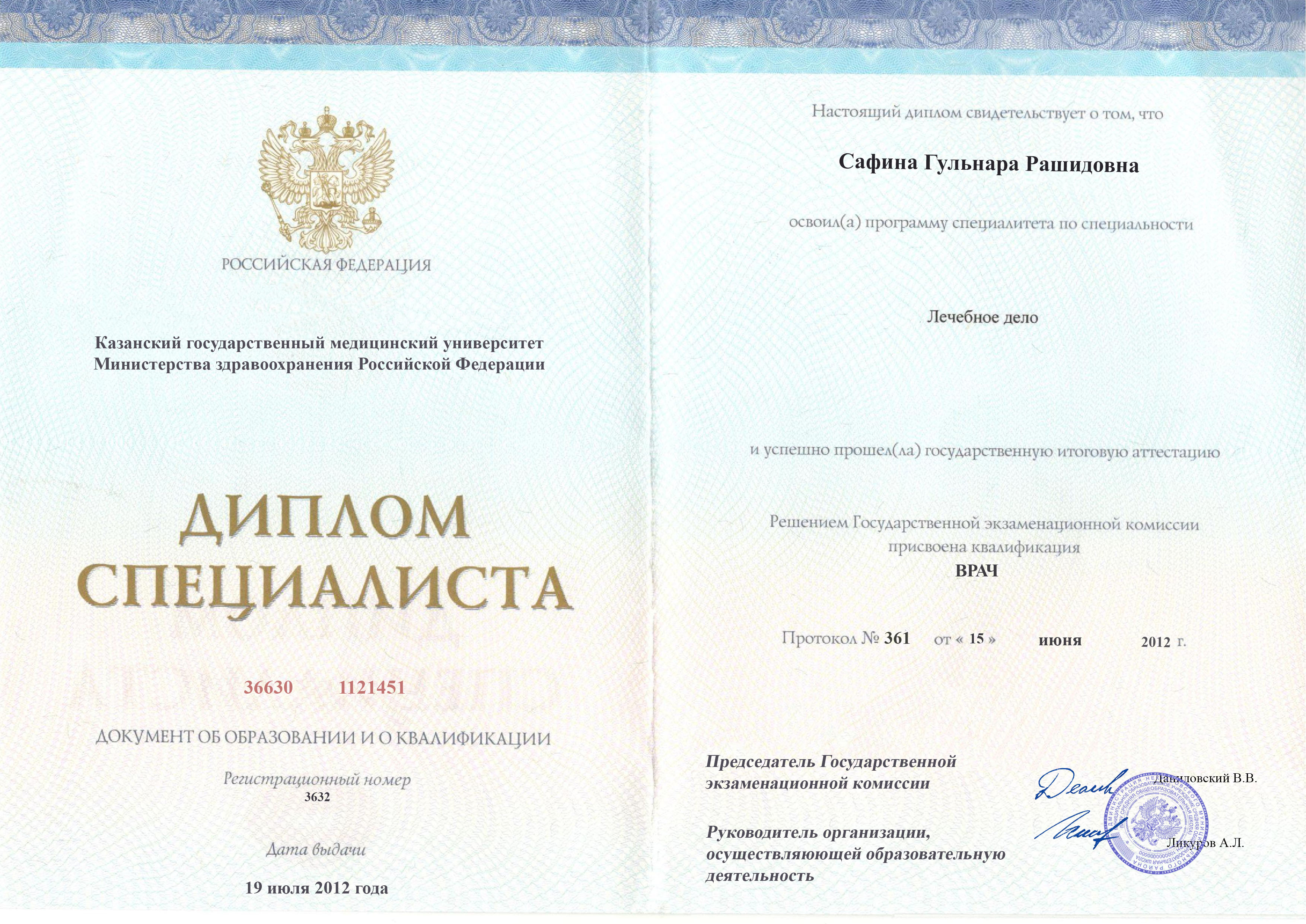 Диплом специалиста Сафиной Гульнары Рашидовны